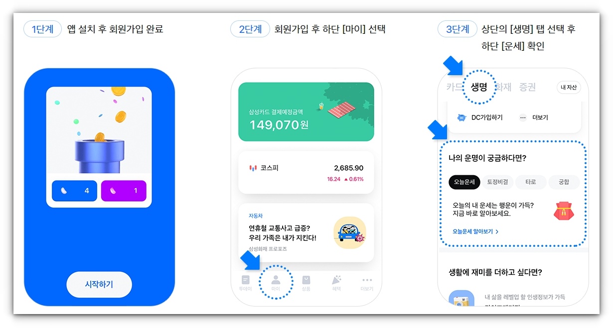 아무래도 삼성생명 보험과 카드를 이용하다 보니, 핸드폰으로 삼성생명 '모니모앱"을 자주 사용하면서, 운세도 종종 보곤 합니다.